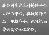 全意鑄鐵平臺(tái)平板廠家專注生產(chǎn)T型槽鑄鐵平臺(tái),大理石氣浮實(shí)驗(yàn)石平臺(tái),han接鑄鐵平臺(tái),裝配鑄鐵平臺(tái),檢測(cè)測(cè)量大理石平臺(tái),試驗(yàn)鑄鐵平臺(tái),測(cè)量大理石平板,T型槽平臺(tái),電機(jī)試驗(yàn)平臺(tái),三坐標(biāo)測(cè)量平臺(tái)等鑄鐵平板來(lái)圖加工定做業(yè)務(wù),以合理的價(jià)格,專注的技術(shù)服務(wù)于國(guó)內(nèi)外客戶,互利合作,共同發(fā)展!公司位于河北交河開發(fā)區(qū),京滬鐵路、104國(guó)道、106國(guó)道、京福高速公路橫穿而過(guò),與我國(guó)的兩大直轄市北京、天津近在咫尺,地理位置優(yōu)越,交通非常便利。我公司本著以誠(chéng)納客”“嚴(yán)把質(zhì)量關(guān)”“價(jià)格優(yōu)惠”“用戶至上的原則,幾十年兢兢業(yè)業(yè),受到用戶的一致好評(píng)!